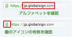 アクセスしたサイトが本当に企業の提供するサイトであることを確かめるには、まずブラウザのアドレス・バーを確認しましょう。アドレスがーが緑になるEV SSLを導入しているサイトであれば一目でわかりますが、そうでないサイトの場合は、下記の点を重点的に確認してください。