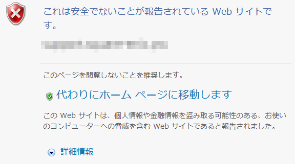 有効期限切れやサーバ証明書の流用が原因のエラーに比べ、遭遇する機会は少なめですが、ブラウザがサイトの危険性を察知すると、このメッセージを発します。