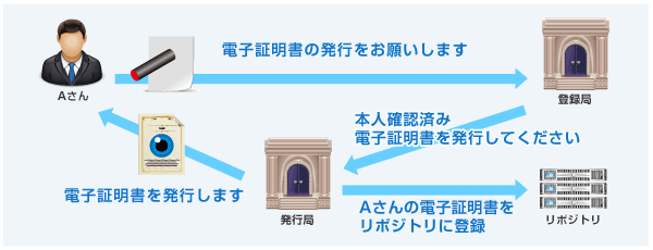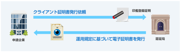 認証局の役割の一つ目は電子証明書を発行することです。たとえば、メールの暗号化などに使われるクライアント証明書の発行の場合、登記事項証明書や印鑑登録証明書を用いて申請元の企業が実在しているかを確認したりします。